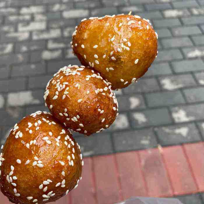形如雞蛋,色澤紅褐,以芝麻裹面,色香味俱佳。其制作方法以糯米加少量大米打粉,加水揉成面團,捏成圓狀,放入加有紅糖(或白沙糖)的油鍋里炸制而成。有色鮮香郁、粘糯適中、味甜不膩、外形美觀等特點,老少咸宜。
